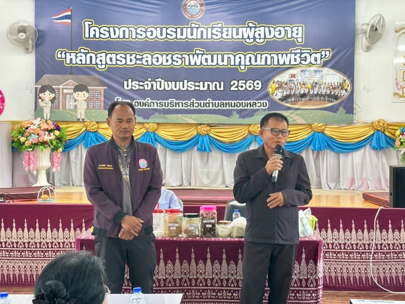 วันที่ 10 มีนาคม 2569 เวลา 08.30 น. นางสรารัตน์ ศรีอุดร นายกองค์การบริหารส่วนตำบลหนองหลวง มอบหมายให้ นายสมใจ ป้องคำไหล รองนายกองค์การบริหารส่วนตำบลหนองหลวง นายอนุวัฒน์ มะโนราช รองนายกองค์การบริหารส่วนตำบลหนองหลวง ร่วมเป็นเกียรติเปิดเรียนโรงเรียนผู้สูงอายุ อบต.หนองหลวง ประจำเดือน มีนาคม ภายใต้โครงการอบรมนักเรียนผู้สูงอายุ “หลักสูตรชะลอชราพัฒนาคุณภาพชีวิต” ประจำปีงบประมาณ 2569 โดยกองสวัสดิการสังคม นางสาวเยาวนาถ ศรีตะบุตร ผอ.กองสวัสดิการสังคม มีกิจกรรมหน้าเสาธง กายบริหาร และเข้าสู่บทเรียนในหัวข้อเรื่อง “นวดแผนไทยและการประคบสมุนไพร” ณ อาคารศูนย์พัฒนาคุณภาพชีวิตและส่งเสริมอาชีพผู้สูงอายุตำบลหนองหลวง อำเภอเฝ้าไร่ จังหวัดหนองคาย