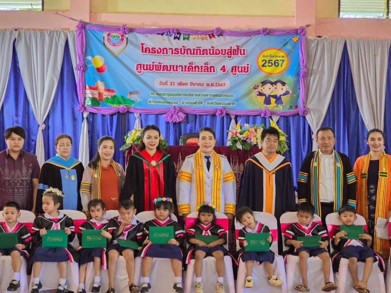 วันที่ 21 มีนาคม 2567 เวลา 10.00 น. นางสมัย ชนาราษฎร์ นายกองค์การบริหารส่วนตำบลหนองหลวง เป็นประธานในพิธีเปิดโครงการบัณฑิตน้อยสู่ฝัน ศูนย์พัฒนาเด็กเล็ก 4 ศูนย์ ประจำปี 2567 ได้แก่ ศูนย์พัฒนาเด็กเล็กแก้วดวงตา (วัดสมศรีสะอาด) , ศูนย์พัฒนาเด็กเล็กบ้านแบง , ศูนย์พัฒนาเด็กเล็กหนองบัวเงิน และศูนย์พัฒนาเด็กเล็กบ้านโนนสมบูรณ์ โดยมี นายวิสิทธิ์ จันทวดี หัวหน้าสำนักปลัด/รักษาราชการแทน ผอ.กองการศึกษาฯ กล่าววัตถุประสงค์ในการจัดโครงการฯ ทั้งนี้ นางสมัย ชนาราษฎร์ นายกฯ ได้มอบอนุบัตร และให้โอวาท อวยพรน้องๆที่สำเร็จการศึกษา โดยมี นายทวี กุลสุวรรณ์ นายสมใจ ป้องคำไหล รองนายกฯ นายชญช์ อินทะมาตร์ รองประธานสภาฯ นำคณะสมาชิกสภาฯ ผู้นำชุมชุน สิบเอกคงเดช โอนากุล นักวิชาการศึกษา ผอ.ศพด. ทั้ง 4 แห่ง และผู้ปกครอง ร่วมแสดงความยินดี ณ ห้องประชุมองค์การบริหารส่วนตำบลหนองหลวง อำเภอเฝ้าไร่ จังหวัดหนองคาย